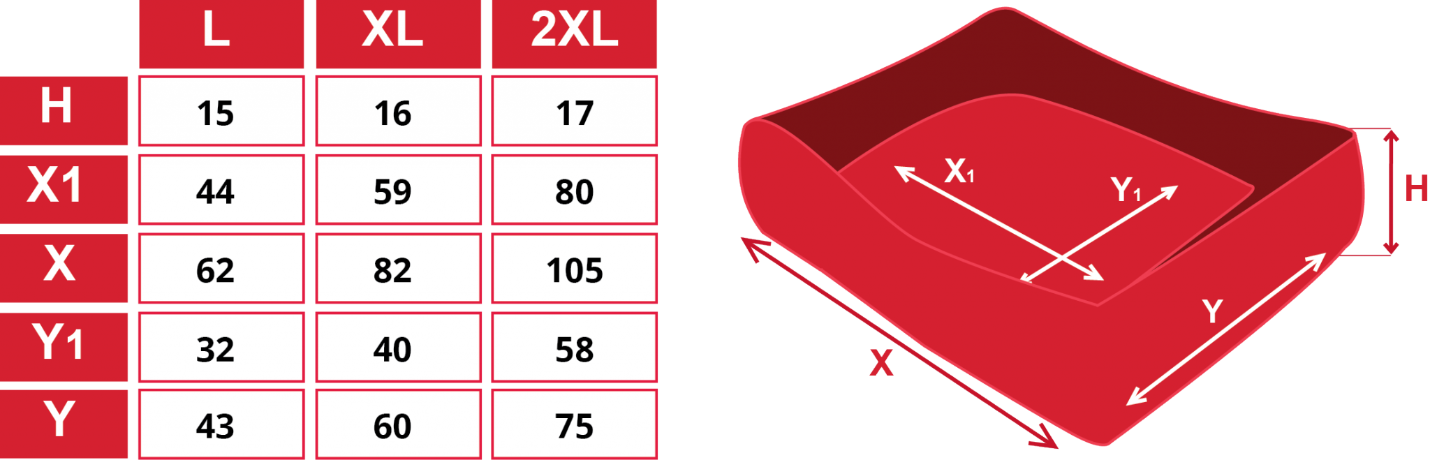 Wählen Sie die passende Grösse für Ihren Hund mithilfe der folgenden Tabelle aus. (*Unsere Nestchen Reedog werden von der Hand genäht. So kann es passieren, dass sich die Grössen leicht unterscheiden, um 2 - 4cm maximal.)
